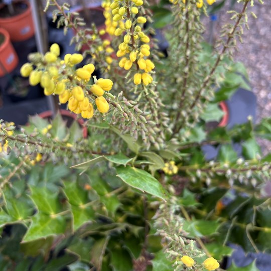 Le mahonia est un arbuste persistant a port dréssé et a feuillage très découpé qui se couvre de fleurs jaune en long élis dressés l'hiver.