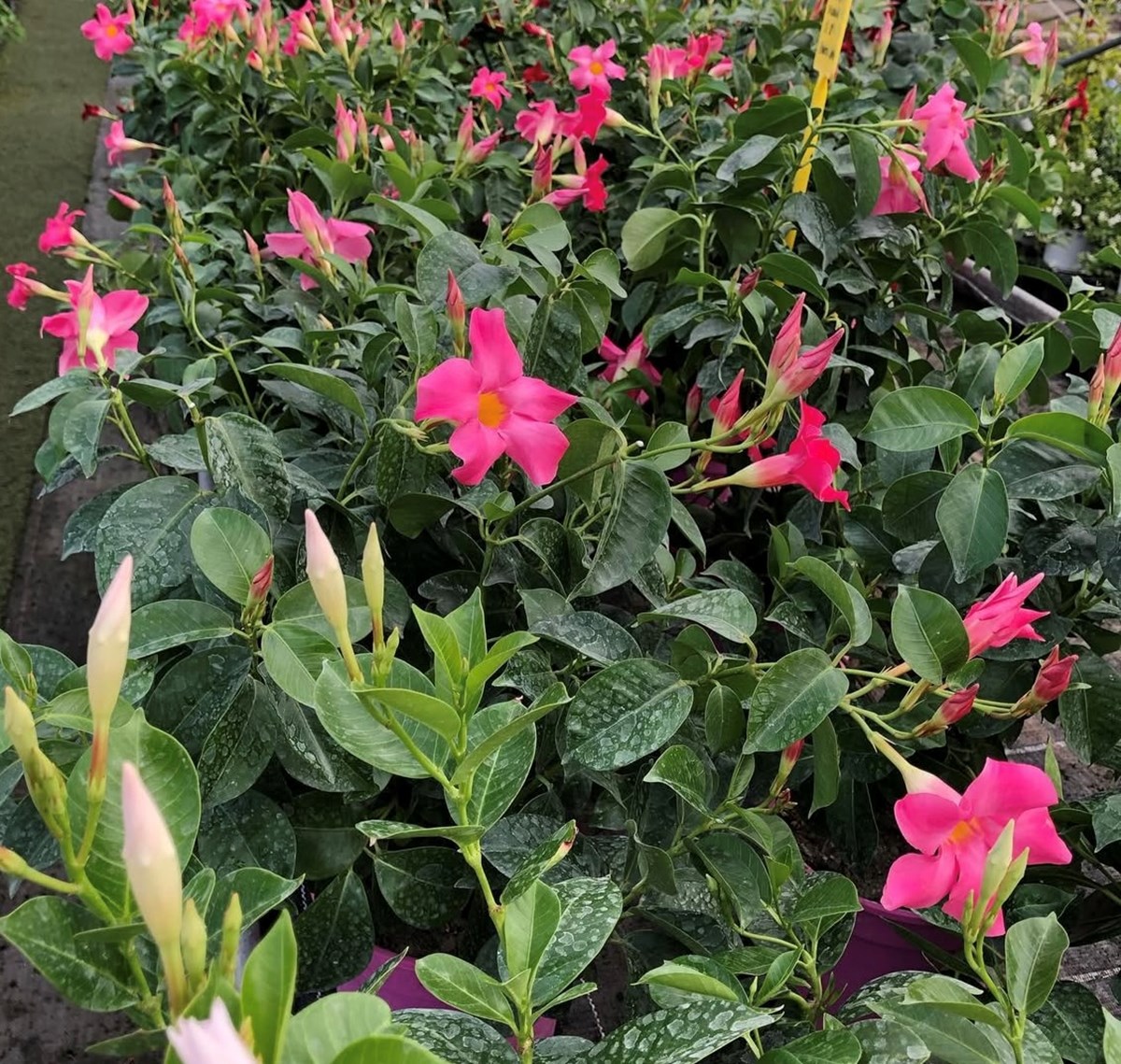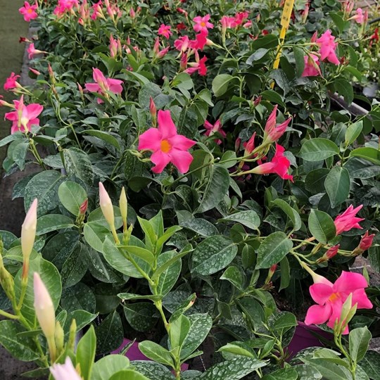 LES DIPLADENIA SONT DES BELLES GRIMPANTES TROPICALES A FLORAISON CONTINUE DE MAI A NOVEMBRE. A CULTIVER EN POT OU A RENTRER L'HIVER DANS LA VERANDA.