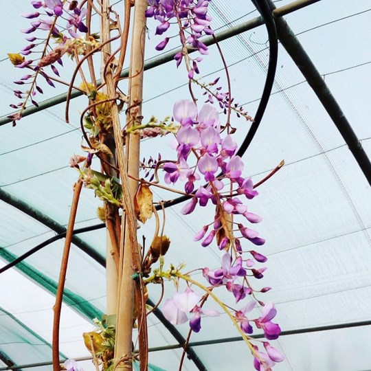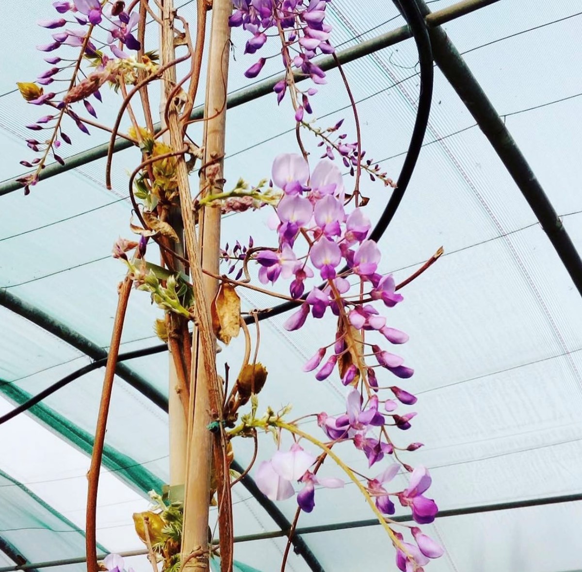 La glycine est une grimpante volubile caduque a fort développement. Elle produit des grappes de fleurs parfumées violette ou blanche de mai a juin avec parfois une remontée de floraison en automne si le temps est clement.